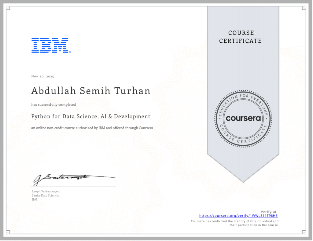 🎓 Completed the fourth module of the IBM Data Science Professional Certificate: “Python for Data Science, AI & Development.”