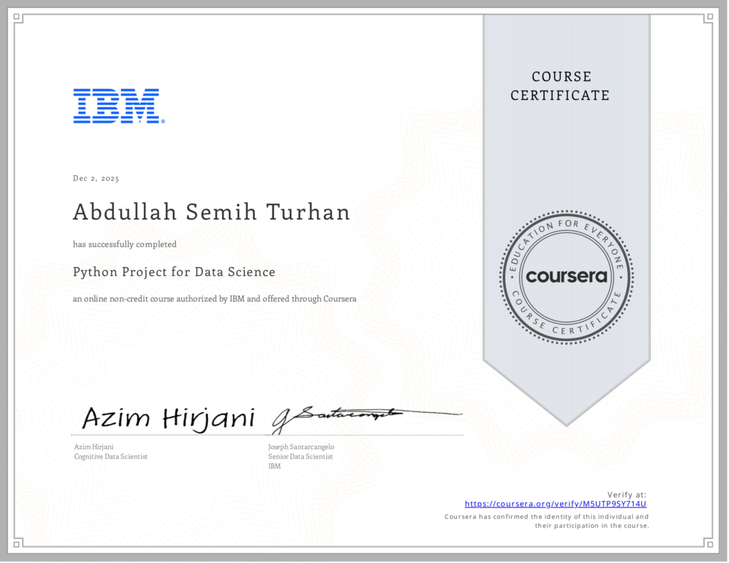 🎓 Completed fifth module of the IBM Data Science Professional Certificate: “Python Project for Data Science.”
